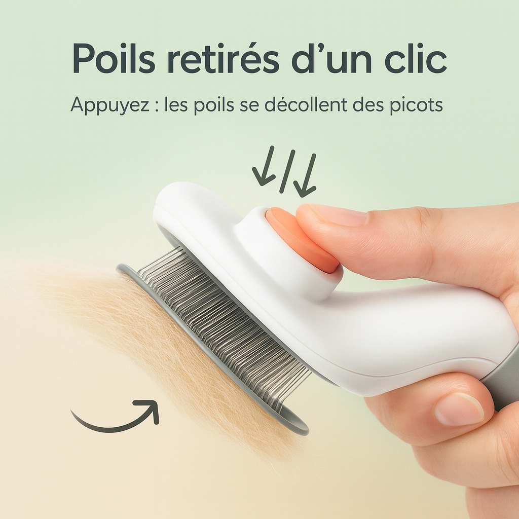 très satisfait de cette brosse, le bouton de nettoyage élimine efficacement les poils, en général cette brosse est essentielle pour les propriétaires de chats.